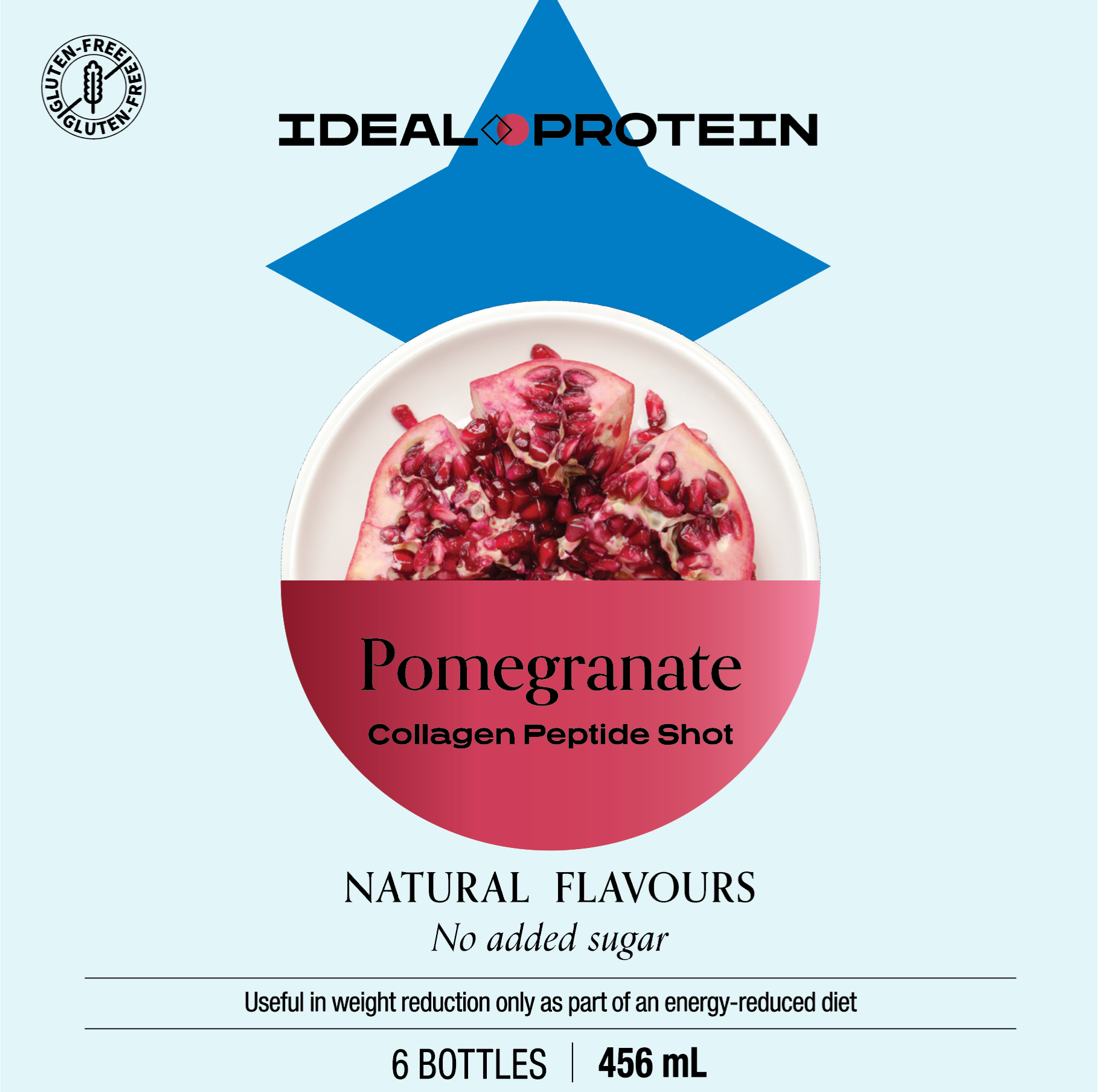 Support your body from the inside out with this ready-to-drink pomegranate collagen shot. Packed with collagen peptides, it’s designed to help maintain healthy skin, hair, nails, and joints — all in a refreshing, convenient liquid form. Perfect for on-the-go nutrition and a simple addition to your Ideal Protein plan.